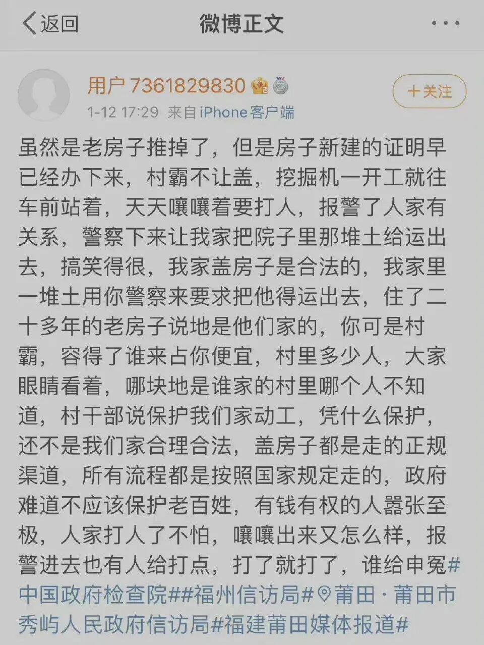 据欧金中在求助信息中自述,2017年,他办理了危房新建手续后,把原有400多平方米的房屋和前后院子全部拆掉,在原地建了150平米的临时住所。欧金中称,他在建新房的过程中,曾多次遭遇附近村民打砸阻止。“虽然是老房子推掉了,但是房子新建的证明早已办下来,村霸不让盖,挖掘机一开工就往车前站着,天天嚷嚷着要打人……我家里住了二十多年的老房子,(村霸)说地是他们家的……” “针对网友反映的基层干部不作为问题,秀屿区纪委、监委已启动调查程序,将依纪依法严肃处理。”2021年10月12日,秀屿区人民政府新闻办公室发布“秀屿区平海镇上林村伤人致死案情况通报”称,2021年10月10日13时50分许,秀屿区平海镇上林村发生一起伤人致死案件,造成2名村民死亡、3名村民受伤。“案件发生后,市、区领导高度重视,立即组织全力救治伤员,要求公安机关调集力量,尽快缉拿犯罪嫌疑人。” 此前,平海镇政府已发布悬赏通告,对提供有价值线索者将奖励5万元。莆田市公安局秀屿分局也于10月10日晚发布“协查通报”,请广大群众积极提供线索,并称,“公安机关对提供线索抓获犯罪嫌疑人者将给予奖励;对窝藏包庇人员,将依法追究法律责任。” “这个事情的进展,请等待官方通报,或关注本地新闻,其他情况我们不便透露。”10月13日上午,封面新闻记者连线秀屿区平海镇人民政府,工作人员未对此事作出实质性回应。随后,记者拨打秀屿区人民政府新闻办公室电话,也只得到“请等待官方通报”的回复。截至记者发稿时,仍没有已抓获犯罪嫌疑人欧金中的消息。当地村民猜测:“他可能躲山里去了。” 这新闻咋一看好像只是因为土地纠纷引发的刑事案件,都说杀人偿命,但在通报下的评论里,网友们却对这名杀人犯表示同情和理解,甚至有人说被害人死有余辜。 这就很令人费解了,到底是个什么样的人,才能让网友们帮他如此求情,甚至希望他不要被抓到? 随着案情更多细节被披露,有网友找到了欧某的网络账号,发现他在很早之前就开始不断发布求助信息。 他求助媒体称,2017年他申请危房翻盖,拆除了自家400平米的房屋,却遭到邻居的阻挠,并且被害邻居还联合附近居民一起阻挠欧某建新房。 走投无路的欧某一家无处可去,只能用铁皮临时搭建一个雨棚,带着89岁年迈的老母亲,一住就是几年。在这几年里,他四处申诉,寻求媒体关注,寻求部门帮助,寻求法律援助,但石沉大海,申诉无门。 他在动态里绝望地说“从来都是老实人按照规矩办事,法律却从来不会站在老实人这一边。” 这位55岁的农村男子,苦苦寻求帮助五年,最后走投无路,摸索着用社交软件试图寻求最后一丝希望。 但积累了六年的委屈和怨恨,在10月10日彻底爆发了。在案发前,台风将欧某家的雨棚吹倒塌,屋顶的铁皮被刮到邻居家,欧某去捡时,却遭到对方的破口大骂。 风把铁皮吹到你家,压到你种的菜,为什么要骂人家呢?这换谁估计都很莫名其妙很恼火吧?令人破防的是,欧某的家真的简陋的不能再简陋了,几个支架搭着铁皮,就是一家人的栖身之处,而且台风天还刮走了一半的铁皮。 明明证件齐全,合理合法,却因为邻居的阻挠,住了六年这样的破棚子,冬天冻得瑟瑟发抖,夏天热得辗转反侧,刮风下雨连屋顶都没了,还要遭受邻居的谩骂。而对比被害邻居的房子,豪华气派,整整四层小洋房,住的要多舒服有多舒服。 欧某的房子显得像个草棚,像个茅屋,连菜地里的温室大棚都更加豪华,完全无法相信欧某是怎么忍气吞声六年。令网友们很难接受的是,媒体在欧某家中翻出了一个烟的包装盒,背面密密麻麻写满了求助电话和信息,各类官媒和举报电话都写上了。 为什么大家同情欧某,哪怕他杀了邻居也希望他不要判死刑,因为很多人都对他的遭遇有所共情,他本是守法本分的老实人,却被逼向了绝路。说他没有良知吧,他又隐忍了六年,最终也没有对孩子痛下杀手,说他有良知吧,他又是确确实实的杀人犯。 欧金中虽然杀人不对,但我能理解这个人的苦衷。他走上了绝路,你说他太偏激,可是他已经用尽了所有能用的所谓正确方法,却得不到任何解决。 这就很令人费解了,到底是个什么样的人,才能让网友们帮他如此求情,甚至希望他不要被抓到? 随着案情更多细节被披露,有网友找到了欧某的网络账号,发现他在很早之前就开始不断发布求助信息。