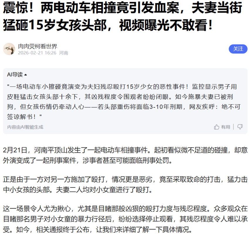 电动车轻碰,竟酿街头暴行,刘某飞夫妇挥鞋猛砸 15 岁少女头部的画面,隔着屏幕都让人脊背发凉。更令人齿寒的,是现场围观者的无动于衷 —— 拳头落下时,皮鞋砸下时,少女的无助哭喊中,周遭的目光或躲闪、或旁观,甚至有人举着手机拍摄,无一人挺身而出,无一人伸手相援。行凶者的恶,是明火执仗的施暴,而路人的冷漠,是助纣为虐的纵容,这份冷眼旁观的凉薄,比拳头更伤人,比皮鞋更刺骨,甚至可说,路人的沉默之恶,更胜行凶者的行为之恶。而这副场景,恰如鲁迅先生百年前痛斥的看客图景,跨越时空,依旧刺目锥心。